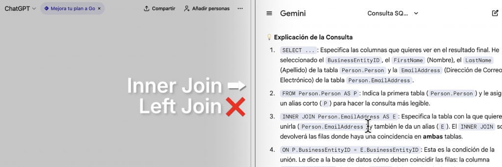 Ambas identificaron correctamente la clave común (BusinessEntityID) y propusieron un INNER JOIN. Sin embargo, ChatGPT fue más allá y sugirió un LEFT JOIN como alternativa, explicando en qué casos sería más adecuado.