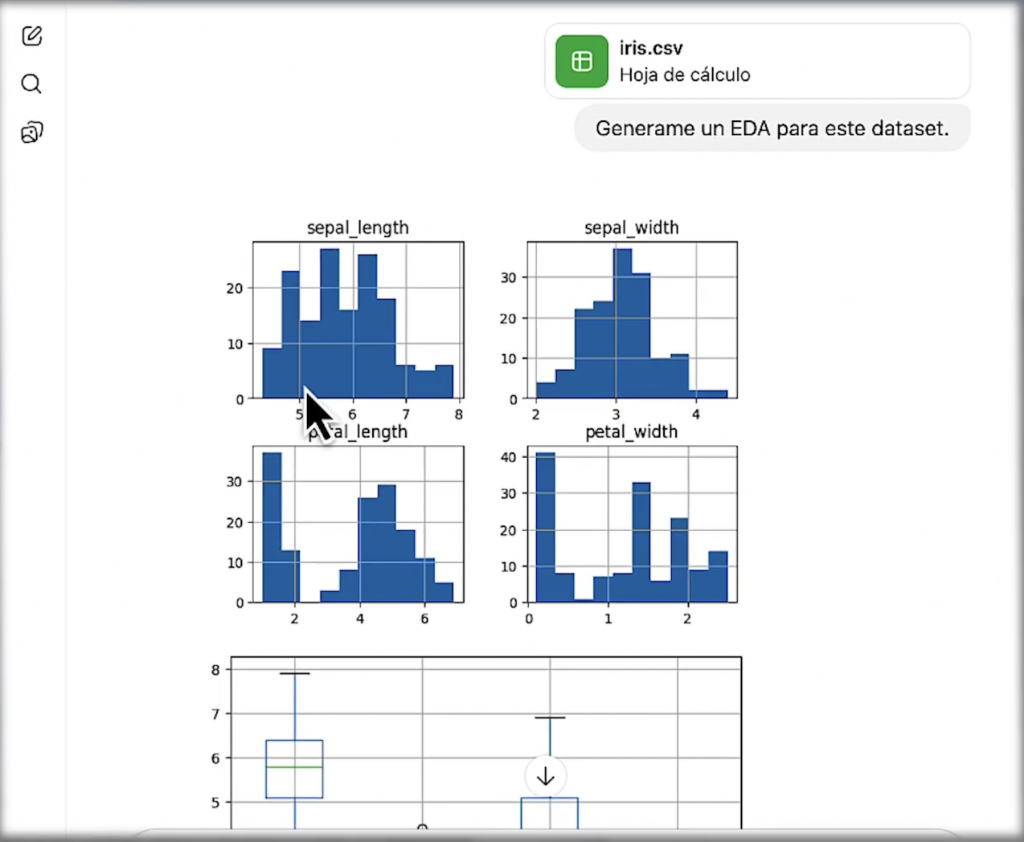 En un análisis exploratorio de datos, no basta con estadísticas descriptivas: las visualizaciones son clave. ChatGPT generó gráficos, explicó correlaciones y contextualizó los resultados del dataset Iris de forma completa.